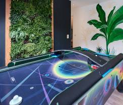 Ce qui rend cette villa vraiment spéciale, c’est la large gamme d’équipements. Vous pouvez vous détendre dans le jacuzzi extérieur, parfait pour se relaxer après une journée bien remplie. De plus, il y a un sauna extérieur qui complète votre expérience bien-être. Pour des soirées conviviales, un terrasse couverte avec un projecteur est disponible, idéal pour regarder un film sous les étoiles. Le grand jardin privé invite à la détente et au jeu, tandis que la salle de jeux avec une table de air hockey garantit du plaisir pour petits et grands.