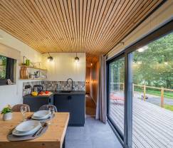 Le tiny house est intelligemment agencé avec une kitchenette compacte et un coin repas cosy. La salle de bain est équipée d'une grande douche à l'italienne, d'un lavabo, de toilettes et d'un sèche-cheveux. Le coin salon invite à des soirées conviviales près du poele à pellets, où vous pouvez vous détendre agréablement et profiter du calme. Il y a une confortable chambre double et un espace de couchage supplémentaire dans la mezzanine, parfait pour les enfants ou les adolescents.