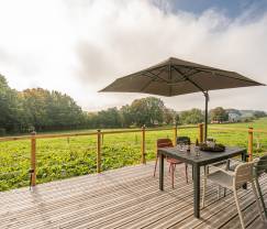 À l'extérieur vous attend une terrasse privée avec une vue à couper le souffle sur la campagne environnante. Le jardin privé et le mobilier de jardin complètent le tableau. En été, vous pouvez allumer le barbecue et profiter d'un repas en plein air. Ce tiny house offre un séjour qui ressemble à un hôtel, mais avec le charme de la vie en plein air et la proximité d'une ferme biologique active.