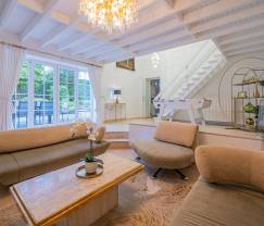 À l'extérieur, vous trouverez un grand jardin privé avec un jacuzzi, une terrasse privée avec barbecue au bois et un terrain de pétanque. Pour les amateurs de chevaux, des boxes sont disponibles sur demande, et à seulement 7 minutes à pied, vous trouverez une piste de dressage professionnelle (65/25 m).