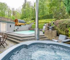 Luxueuse maison de vacances avec piscine extérieure, sauna, bain nordique, baignoire balnéo et un emplacement idéal entre plaisirs de la ville et nature préservée.