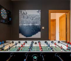 Magnifiquement située, cette maison mérite tous les superlatifs. Toutes ses pièces sont décorées avec beaucoup de goût et leur mobilier de qualité offre un confort optimal. Ainsi le salon, avec ses fauteuils confortables, vous invitera à de longues conversations nocturnes à la lueur chaleureuse du feu ouvert à cassette. Il est prolongé par l'accueillante salle à manger et un espace de jeux pour les enfants avec un kicker et un jeu de fléchettes. Dans la cuisine parfaitement équipée, les cuistots de votre groupe trouveront tout ce dont ils ont besoin pour mitonner de bons petits plats. Les 4 chambres douillettes vous offriront un sommeil paisible. Et les enfants adoreront leur lit superposé. Il y a également 2 salles de bain. Le confort et la détente ont été pensés partout. Sous l'escalier, vous trouverez même une console de jeu avec une vraie chaise de jeu. Game over ? Mais non, la visite continue avec la vaste et magnifique terrasse et ses nombreux agréments : piquer une tête dans la piscine, vous détendre dans le sauna ou le jacuzzi ou somnoler bercés par le murmure de la fontaine construite par le propriétaire, un tailleur de pierre. Au-dessus de la terrasse, un escalier mène au jardin supérieur qui donne sur la forêt toute proche. Vous l'aurez compris, vous êtes ici dans un lieu enchanteur !